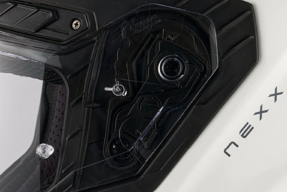 Équipé du système Recoil Visor de NEXX, le mécanisme de la visière utilise des plaques de base à ressort conçues avec précision pour tendre automatiquement la visière contre les bourrelets à double lèvre, ce qui garantit une étanchéité parfaite et une isolation phonique optimale. Le système fonctionne indépendamment du support de crête pour un réglage sans effort.