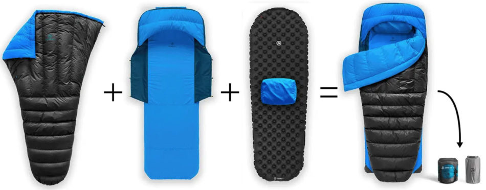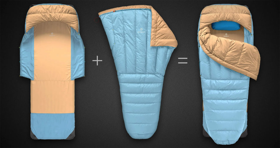 Le deuxième composant du système de lit Zenbivy est une couette (quilt)™ en duvet de canard associée à un drap léger intégrant un pare-vent. Ces deux éléments sont maintenus ensemble par des clips en plastique (un modèle avec fermeture à glissière est également disponible). Grâce à sa conception brevetée, la couette «flotte» librement au-dessus de vous tout en restant bien ajustée sur vos côtés et vos épaules, vous protégeant ainsi des courants d’air, sans restreindre vos mouvements. La couette est disponible en trois tailles (régulier, L, XL) et en deux versions Fast Footbox ou Convertible Footbox. Elle est déclinée en trois niveaux de température (25°F, 10°F, -5°F soit -4°C, -12°C, -20°C) et quatre coloris. Le rembourrage est assuré par du duvet de canard gris 90/10 HyperDRY 800FP ayant reçu un traitement déperlant (sans PFAS). Une version dotée d’un rembourrage synthétique est également au catalogue. Le drap est proposé dans les mêmes coloris.