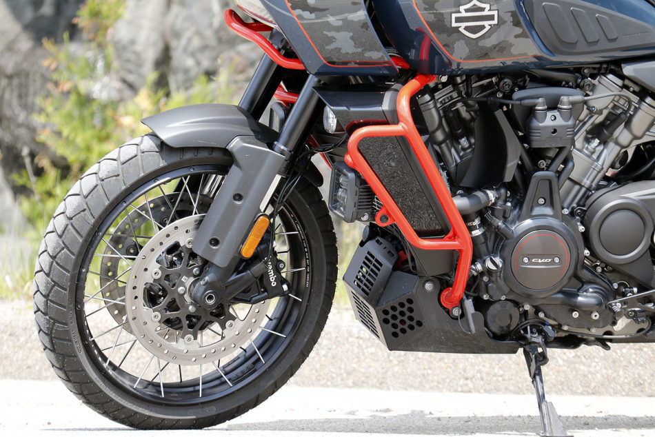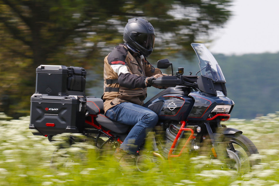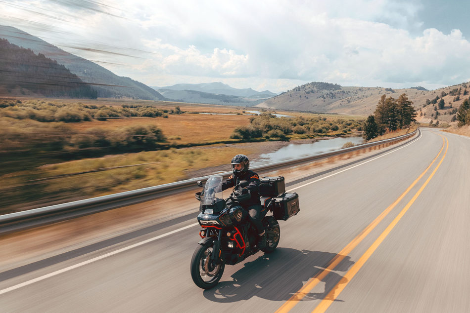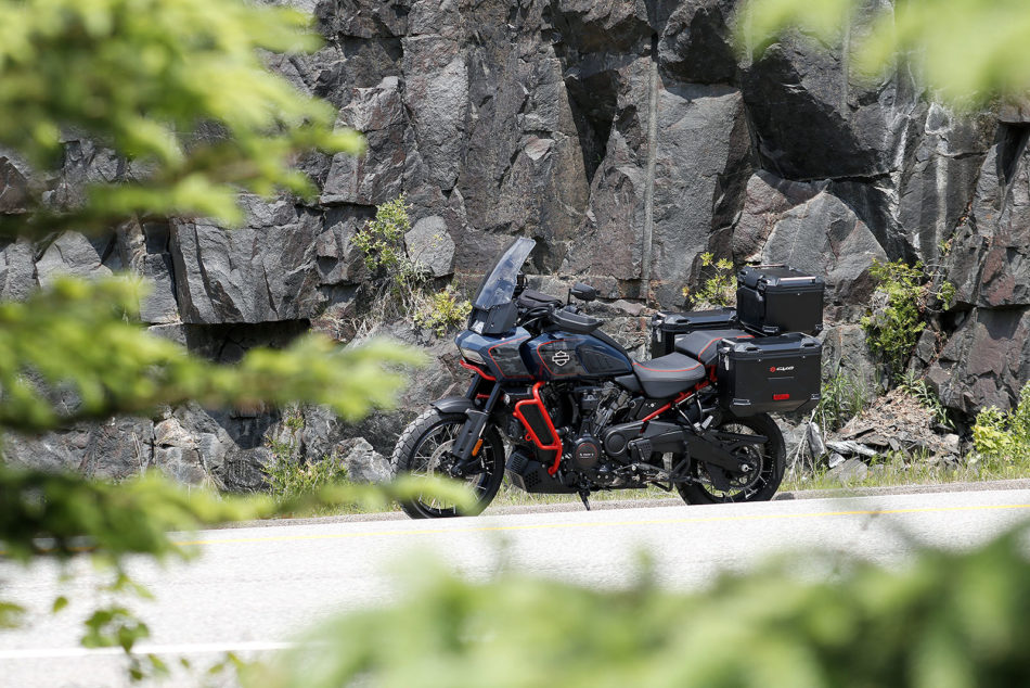 Dès qu’on quitte les zones urbaines, la Harley-Davidson se distingue par l’agilité et la précision de sa partie-cycle, ainsi que par l’enthousiasme de son moteur. Dans les hauts régimes, le son du bicylindre en V est gratifiant, même si l’échappement est plutôt étouffé. Sa position de conduite est axée «route» et moins aventurière que ses concurrentes directes. On a l’impression de faire corps avec la Pan America. Son guidon est positionné haut pour optimiser la conduite en position debout. En position assise, sur route sinueuse, le pilote est assis dans la moto, ce qui ne favorise pas l’attaque. La partie cycle est saine et intègre, les suspensions semi-actives idéalement calibrées et un freinage de haut niveau.