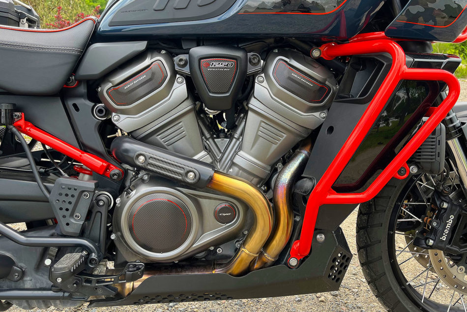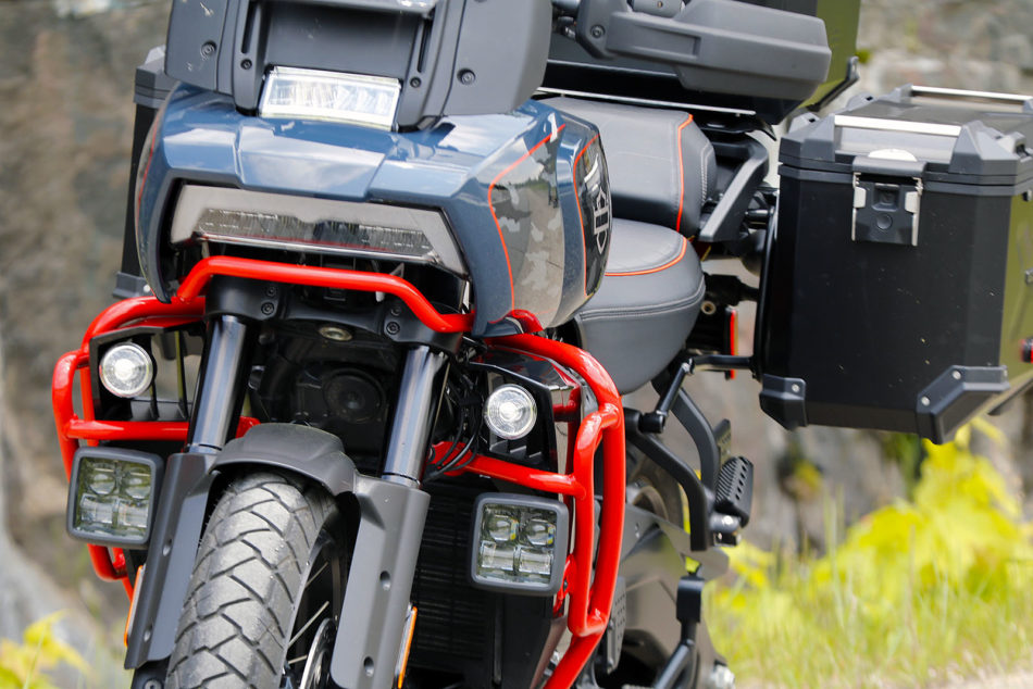 La CVO est équipée d’une variété d’accessoires haut de gamme, tels qu’un régulateur de vitesse, un sabot en aluminium massif, des phares additionnels DEL à triple fonction (antibrouillard, feux de route et feux tout-terrain), une selle ornée d’un liseré orange, un quickshifter bidirectionnel de la gamme Screamin’ Eagle, le système Adaptive Ride Height (AHR) qui abaisse la moto à l’arrêt, des jantes à rayons tangentiels sans chambre à air, un sac de voyage Adventure, une protection de radiateur, des protège-genoux, un pare-brise de 28 cm de haut, un support de téléphone usiné CNC, une protection d’échappement et une housse haut de gamme ornée du logo CVO. Elle bénéficie également du phare doté de la technologie Advanced Daymaker Adaptive Headlamp qui utilise l’unité de mesure inertielle (IMU) pour déterminer l’angle d’inclinaison et projeter automatiquement un éclairage supplémentaire dans les virages non éclairés. Tout cet équipement fait grimper la facture de 10 000 $ par rapport à la Pan America 1250 de base pour atteindre 35 599 $. Ça commence à chiffrer…