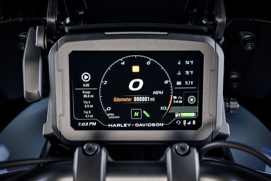 Outre les modes de conduite et le quickshifter, la Pan America CVO est également équipée d’une électronique qui rivalise avec les meilleures technologies sur le marché, notamment l’ABS en virage et le contrôle de traction, le dispositif Hill Hold Control de démarrage en côte et le système de contrôle du frein moteur (DSCS) qui gère le patinage de la roue arrière lors de la décélération. Pour ceux qui aiment faire patiner la roue arrière ou faire des wheelies, il est possible de désactiver le contrôle de traction en appuyant rapidement sur le bouton TC. La moto doit être en marche et à l’arrêt pour désactiver le TC, mais celui-ci se réactive si vous passez à un autre mode. Quant à l’ABS, il n’est pas entièrement désactivable, mais en mode Off-Road, si vous maintenez le bouton «Mode» enfoncé, le réglage Off-Road Plus s’active, ce qui désactive l’ABS à la roue arrière et vous permet de déraper dans les virages.