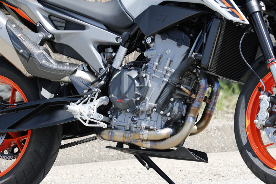 À l’exception de la Kawasaki, qui possède un twin classique à 180°, les autres motos mentionnées plus tôt sont équipées d’un moteur bicylindre vertical calé à 270°, ce qui leur confère une personnalité plus affirmée. Dans le cas des machines austro-suédoises, elles se démarquent du lot par leur moteur KTM LC8c au calage inédit de 285°. Par rapport aux Twins à 270°, le LC8c diffère par l’angle entre les manetons du vilebrequin, ce qui influence la sonorité, les vibrations et le caractère moteur ; le 270° simule un V-Twin (son rauque, couple élevé), avec un intervalle d’allumage irrégulier, tandis que le 285° est plus proche dans son comportement d’un calage à 360° (son plus continu, plus lisse), mais avec une meilleure répartition de la puissance et un équilibre dynamique amélioré. Il offre un compromis entre sonorité, souplesse, régularité et facilité d’exploitation.