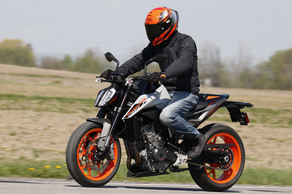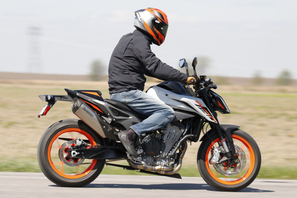 Elle est plus nerveuse et plus incisive que ses cousines suédoises. Avec son ergonomie agressive, sa selle plus haute de 5 mm et sa position de conduite basculée vers l’avant, davantage axée sur la conduite sportive, elle se révèle extrêmement précise dans les grands virages rapides, comme dans les courbes serrées, les épingles et les pifs pas. Au point de pouvoir s’aventurer sur piste, occasionnellement, pour des journées de roulage, pour peu qu’elle soit chaussée des bons pneus. Sur les routes sinueuses, la Duke est à sa place et mérite bien son surnom de « scalpel ». C’est une moto sportive affûtée qui peut sans crainte rivaliser avec tous les roadsters sportifs du marché.