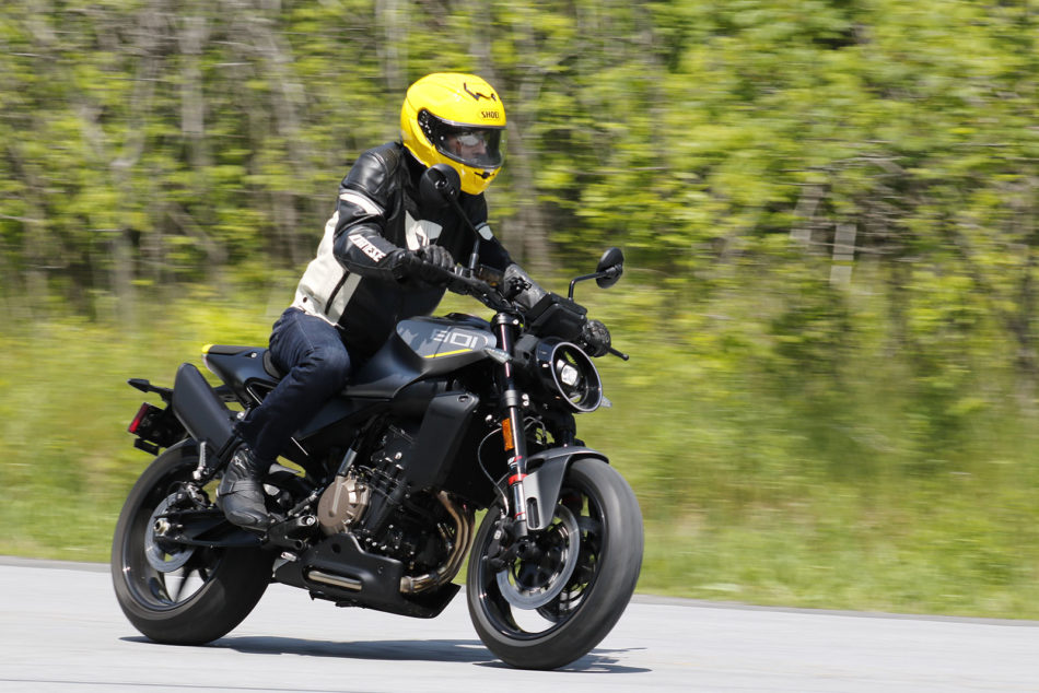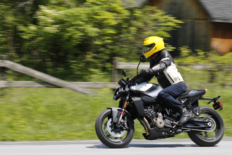 En raison de sa selle passager étroite, peu rembourrée et haut perchée, la Vitpilen favorise la conduite solo et les plaisirs solitaires. La réponse à l’accélérateur est franche et l’injection est bien calibrée. Ses suspensions qui offrent plus de réglages que celles de la KTM permettent d’adapter le comportement de la moto aux conditions de la route plus facilement. Elles favorisent la performance, mais aussi le confort.