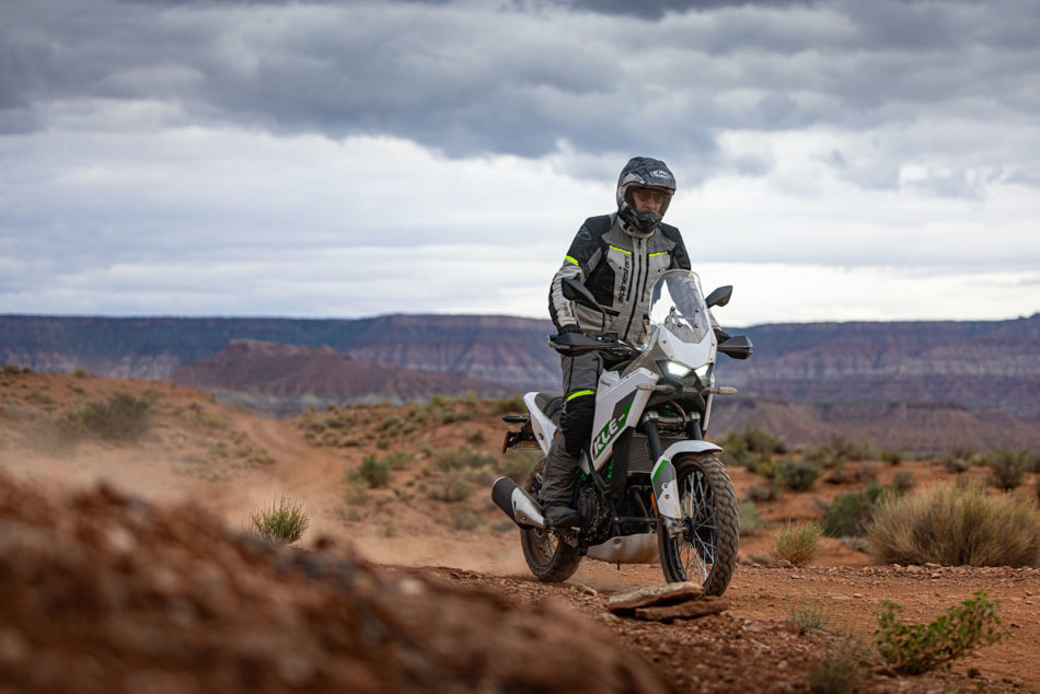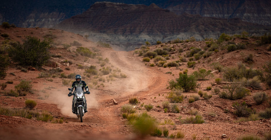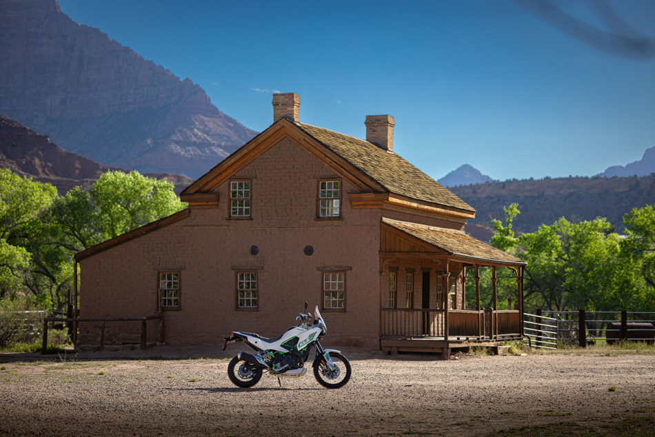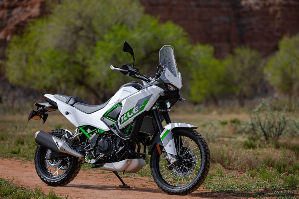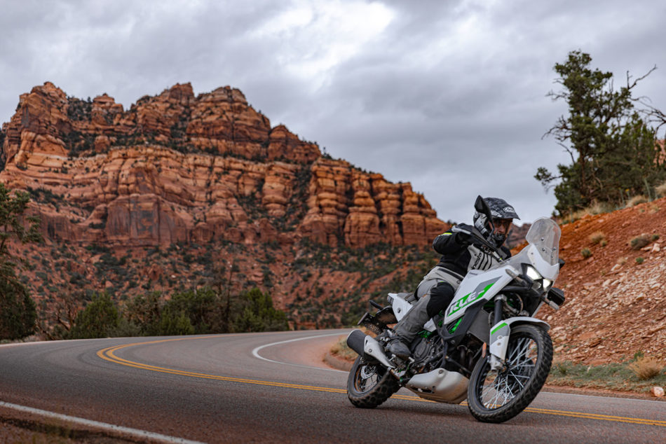 Kawasaki a une solution pour les motocyclistes qui ne souhaitent pas nécessairement rouler en mode «hard-enduro» lors de leurs explorations, mais préfèrent le faire à un rythme plus tranquille, tout en perfectionnant leurs compétences en aventure tout-terrain. Cette solution, c’est la nouvelle Kawasaki KLE500, que nous avons eu l’occasion d’essayer lors de sa récente présentation à la presse, organisée dans l’arrière-pays aux teintes rouillées situé juste à la sortie de Virgin, dans l’Utah. La région offre d’innombrables sentiers qui sillonnent un décor spectaculaire, mis en valeur par des formations rocheuses imposantes et des canyons profondément sculptés — en d’autres termes, un paradis idéal pour les randonnées d’aventure.