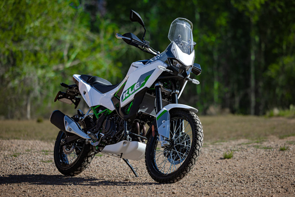 KYB fournit la fourche inversée à cartouche de 43 mm, ainsi que la suspension arrière à bras oscillant et l’amortisseur unique. Le seul réglage de suspension disponible est la précontrainte arrière. Les roues ont un débattement suffisant pour affronter des sentiers tout-terrain légers et modérés : 210 mm à l’avant et 196 mm à l’arrière. C’est un débattement nettement supérieur à celui des modèles routiers de la gamme KLE, mais, comme le moteur est positionné relativement plus bas dans le cadre pour laisser place à l’admission à flux descendant et au boîtier de filtre à air plus grand, la garde au sol ne gagne que 40 mm, pour atteindre 185 mm.