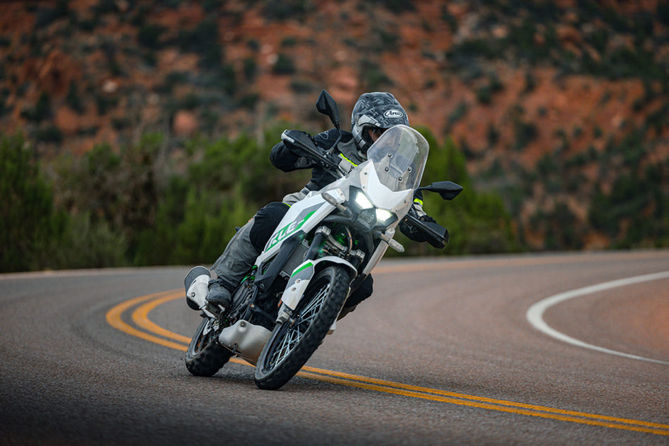 Sur les routes sinueuses, la KLE semble légère et se manie avec assurance. Même si elle n’aborde pas les virages avec la précision de direction de la Ninja 500 ou de la Z500, qui sont plus basses, ont une suspension plus rigide et roulent sur des roues de 17 pouces, elle enchaîne néanmoins les virages en S avec fluidité. Il faut adopter un style de conduite plus subtil pour maintenir un rythme soutenu. Le moteur a besoin de monter en régime pour raccourcir les lignes droites, ce qui est amusant, car cela donne à la moto le son et les sensations d’une moto sportive légère. Mais contrairement à une moto sportive, vous ne pouvez pas freiner brusquement avant d’aborder le virage, car cela absorbe la majeure partie de la course de la suspension et perturbe l’entrée en virage. Freinez en douceur, plus tôt, et maintenez une vitesse élevée en virage tout en gardant le régime élevé à la sortie, et la KLE impressionnera vos amis motocyclistes adeptes de sportives. Et les pneus IRC impressionnent par leur très bonne adhérence sur la chaussée.
