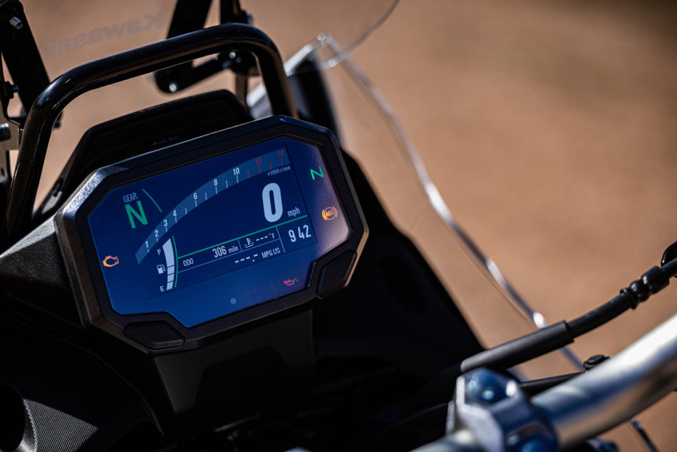 La KLE n’est pas équipée d’un contrôle de traction et n’en a pas plus besoin que la Ninja 500 ou la Z500. La délivrance de puissance est extrêmement fluide, et, si vous voulez vraiment faire patiner le pneu arrière sur la terre, vous devrez vous y employer en laissant le moteur monter haut dans les tours, aux rapports inférieurs. Elle ne dispose pas non plus de modes de conduite, ce qui s’est avéré être une pause rafraîchissante pendant cette prise de contact. Je n’ai pas eu à détourner mon attention de la route pour essayer de sélectionner différents modes; lorsque vous passez du bitume à la terre, vous pouvez simplement continuer à rouler — à une exception près. La moto est équipée d’un système ABS de base, qui est débrayage, vous devez donc penser à le désactiver avant de vous aventurer hors route. Cela se fait facilement à l’aide d’un bouton dédié sur le commutateur gauche. Il faut toutefois s’arrêter complètement pour le désactiver ou le réactiver; il est activé par défaut à chaque mise en marche du contact.