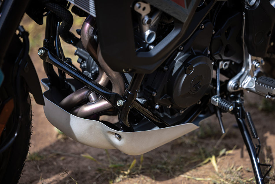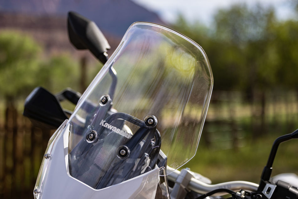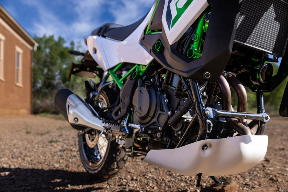 La position de conduite est conçue pour rendre la conduite debout très confortable, et, avec mes 1,80 m, je peux en attester. Malgré ma taille, je ne me voûte pas lorsque je suis debout (j’avais dû ajouter des rehausses sur ma KLR650 pour y parvenir), et la moto est plus étroite entre les jambes que sur la KLR. Les panneaux latéraux et le réservoir de carburant sont également très lisses, ce qui vous permet de vous déplacer d’avant en arrière sans que votre pantalon ou vos bottes ne s’accrochent à des bords tranchants lorsque vous êtes debout, bien que la peinture sur les panneaux soit sujette aux éraflures, comme je l’avais remarqué sur l’une des motos d’un membre du personnel qui avait beaucoup roulé. Des protections en plastique sont placées à côté des repose-pieds pour empêcher vos bottes d’érafler le cadre.